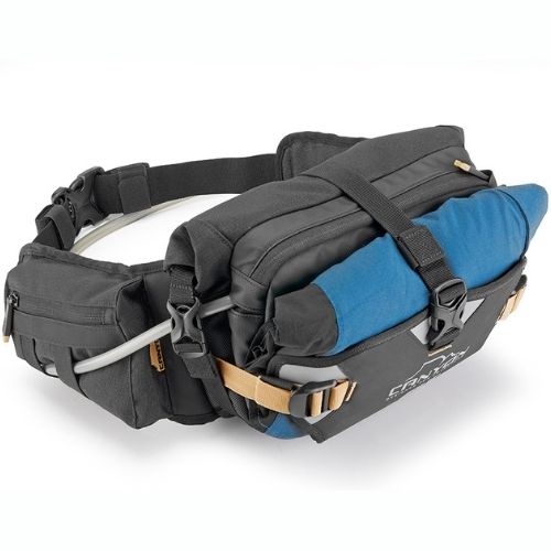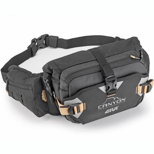 La riñonera GIVI GRT732 Canyon está diseñada para enduro y rutas off-road, con capacidad de 8 litros. Incluye compartimento principal impermeable para documentos, herramientas o ropa, y bolsillo delantero preparado para bolsa de agua HydraPak. Cuenta con dos bolsillos laterales con cremallera y ojales para el tubo de agua, solapa frontal de Hypalon con bolsillo de red y parte posterior ergonómica ventilada para mayor confort. Fabricada con materiales resistentes, incorpora motivos reflectantes para mejorar la visibilidad y garantizar seguridad y comodidad en terrenos irregulares.