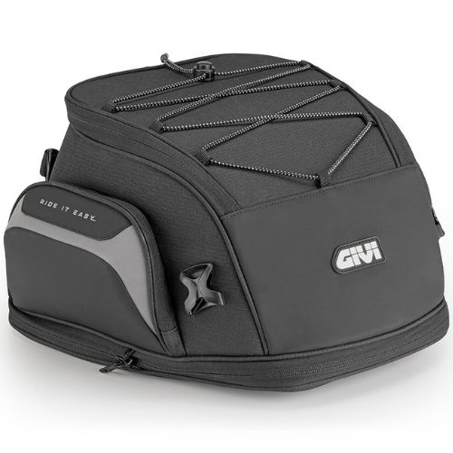 La bolsa sillín GIVI EASY08 es una bolsa sillín con una estructura, que aumenta su capacidad de 19 a 23 litros y permite adaptar el volumen de carga. Se fija a la moto mediante correas específicas con clips de desenganche rápido, que aseguran estabilidad, un montaje sencillo y una extracción rápida. Esta bolsa de sillín cuenta con bolsillos exteriores y de un elástico en la tapa muy útil para sujetar fácilmente guantes o pequeños accesorios. Además incluye una funda resistente al agua, correa de seguridad e inserciones reflectantes para una mayor visibilidad.