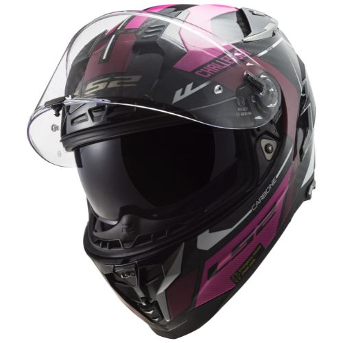 El casco LS2 FF327 CHALLENGER CT2 es un casco integral sport touring, que está fabricado en fibra de carbono avanzada para un peso ultraligero y una excelente protección contra los impactos. Su interior es transpirable, extraíble y lavable, con un sistema de ventilación canalizado con entradas de aire frontales y extractores traseros. Este casco dispone de pantalla transparente Pinlock Ready anti-arañazos y anti-UV, visor solar integrado e incluye Pinlock 100% Max Vision. Además, cuenta con sistema de cierre de anilla Doble-D.